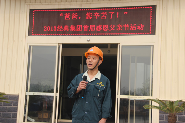 2013616日上午7點(diǎn)30分,經(jīng)典集團(tuán)開(kāi)展2013年度父親節(jié)“送溫暖,獻(xiàn)愛(ài)心”活動(dòng),為集團(tuán)全體員工的父親送上愛(ài)心手機(jī),千元節(jié)日紅包,集團(tuán)董事長(zhǎng)苗樹(shù)文,總經(jīng)理杜福生及高層領(lǐng)導(dǎo)先后致辭并發(fā)放獎(jiǎng)金及手機(jī)。活動(dòng)舉行完后,經(jīng)典集團(tuán)總經(jīng)理杜福生親自到部分員工家中為員工父親送上集團(tuán)的問(wèn)候與節(jié)日祝福。