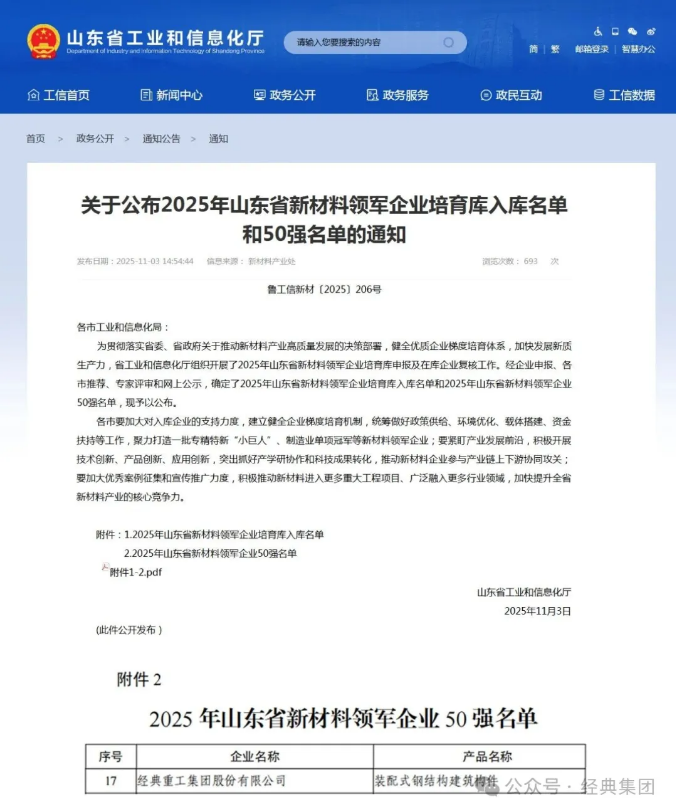 近日,山東省工業和信息化廳公布2025年山東省新材料領軍企業50強名單,經典重工集團股份有限公司憑借深厚的技術積淀、卓越的創新實力與廣泛的行業影響力,再度榮耀入選。這不僅是對集團在新材料領域持續深耕的權威肯定,更是推動產業高質量發展的有力印證。