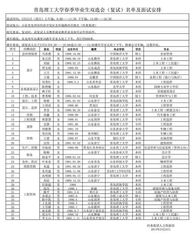 雙選會現場畢業生共投遞我公司簡歷286份,經過初試篩選,進入復試人員38位,具體復試安排及進入復試人員名單請參考《青島理工大學春季畢業生雙選會(復試)名單及面試安排》。